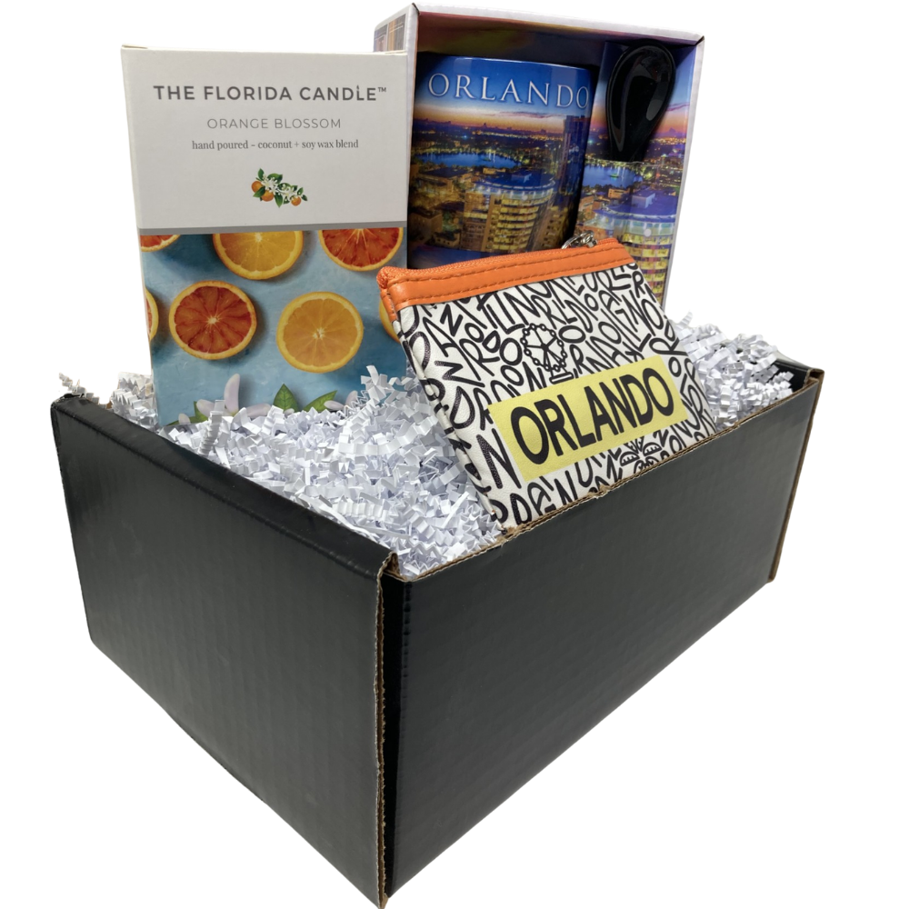 Experience the essence of Orlando with this curated set featuring a Florida Candle in invigorating Orange Blossom, a stylish Orlando-themed mug, and a convenient Orlando change purse. Each item captures local charm while offering practicality and elegance.