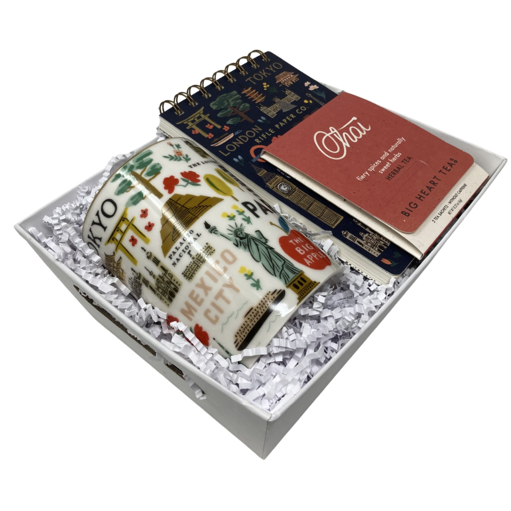 Experience the perfect pairing for your journeys with the "Travelers Delight" set. Start your day with the charming Rifle Paper Company Bon Voyage Mug, designed to inspire wanderlust during every sip. Keep your thoughts and plans organized in the matching Bon Voyage Small Top Spiral Notebook, ideal for quick notes and travel journaling. Complement your ritual with the soothing warmth of Big Heart Tea Company Chai Tea, crafted for a comforting and invigorating experience wherever you go. This curated collection blends functionality and style, making it an essential companion for any traveler.