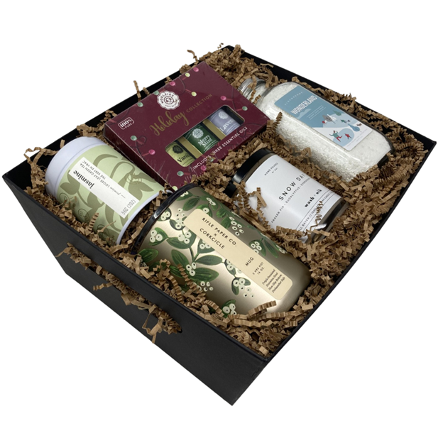 Wash & Wik Snow Day Candle | FinchBerry Fizzy Salt Soak Wonderland | Corkcicle Mistletoe Mug | Woolzie Holiday Collection Essentia Oils | Good Citizen Jasmine Tea